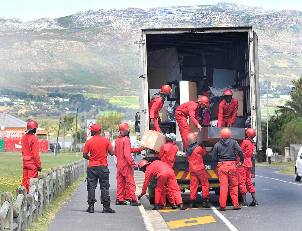 The Red Ants - in their red overalls and protective gear - stood with their shields up as their colleagues boxed up belongings and placed them on trucks.