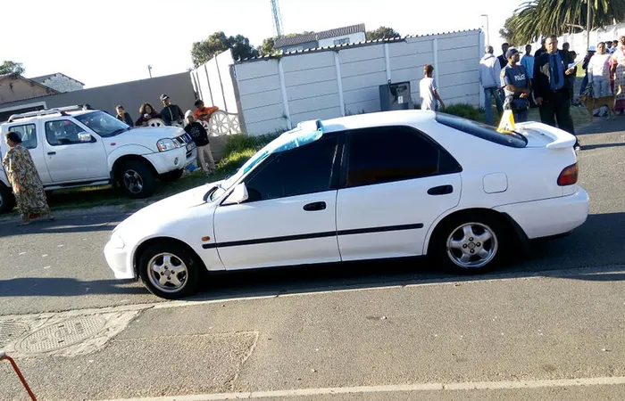 The Honda in which the men were shot dead in Bonteheuwel on Sunday. The Honda in which the men were shot dead in Bonteheuwel on Sunday.