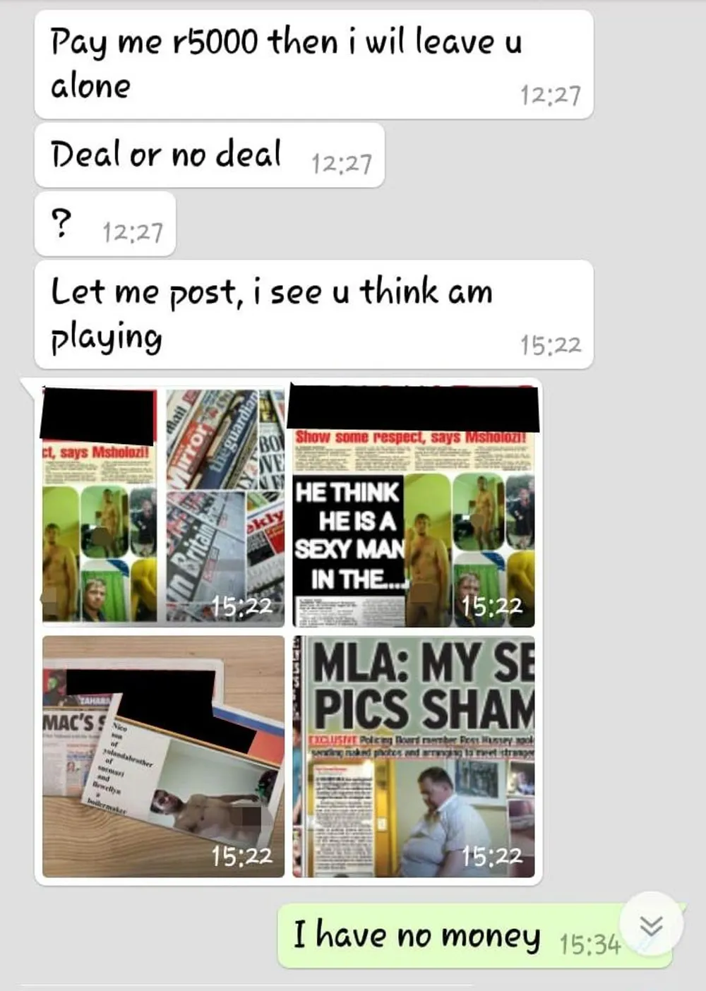 Her one message reads: “I see you are f***ing me around, am going to post your pictures on your Facebook page and inbox your family members and Youtube or else pay me and I will stop this. Pay me R5 000 and I will leave you alone. (sic)”