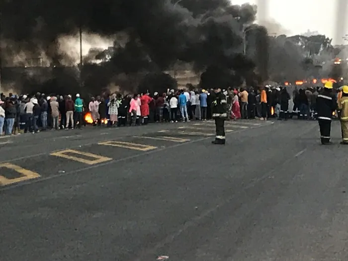 Burning tyres and debris blocked the roads and police in the area were immediately deployed to the scene opposite the provincial traffic offices.