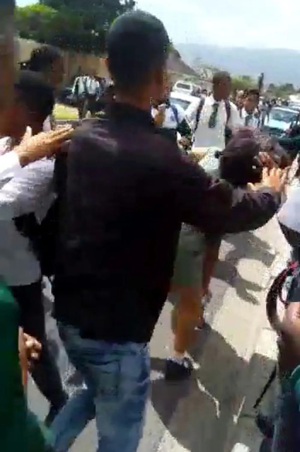 Motorists can be seen passing the brawl and a taxi driver at the corner hoots at the rowdy pupils.