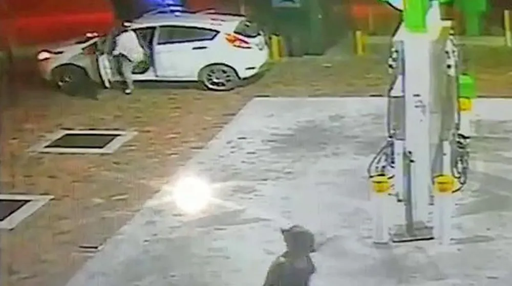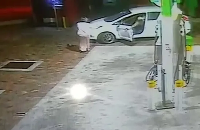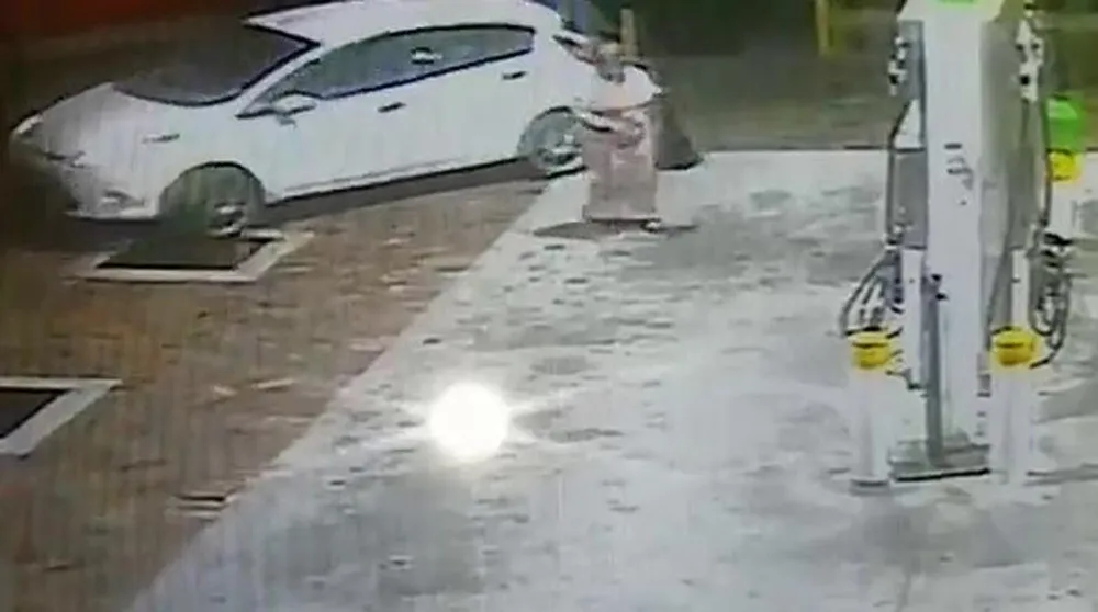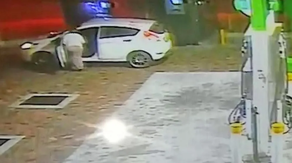 The 22-second video shows the white Ford Fiesta standing stationary at the garage near two ATMs, where a woman wearing a tank top and shorts is apparently withdrawing cash.