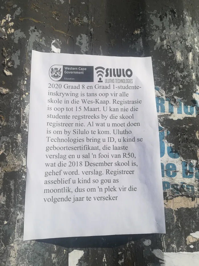 The fake advert reads: "2020 Grade 8 and Grade 1 students enrollment is currently open for all schools that are in the Western Cape. Registration is open until the 15th of March. You cannot register the students directly at the school all you need to do is come at Silulo Ulutho Technologies bring with you your ID, your child’s birth certificate, the last report and you will be charged a fee of R50 which is the 2018 December report. Please register your child as soon as possible so is to secure a place for the for next year."