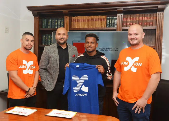 Lamont Hoffmeester; Junxion Creator, Grant Fredericks; African News Agency CEO, Kermit Erasmus from Cape Town City football club and Michael Garrett; Junxion Creator announced Kermit as the new Global Brand Ambassador for Junxion, the new social media app. The announcement takes place at African News Agency offices in Cape Town. Picture: Courtney Africa/African News Agency(ANA) Lamont Hoffmeester; Junxion Creator, Grant Fredericks; African News Agency CEO, Kermit Erasmus from Cape Town City football club and Michael Garrett; Junxion Creator announced Kermit as the new Global Brand Ambassador for Junxion, the new social media app. The announcement takes place at African News Agency offices in Cape Town. Picture: Courtney Africa/African News Agency(ANA)