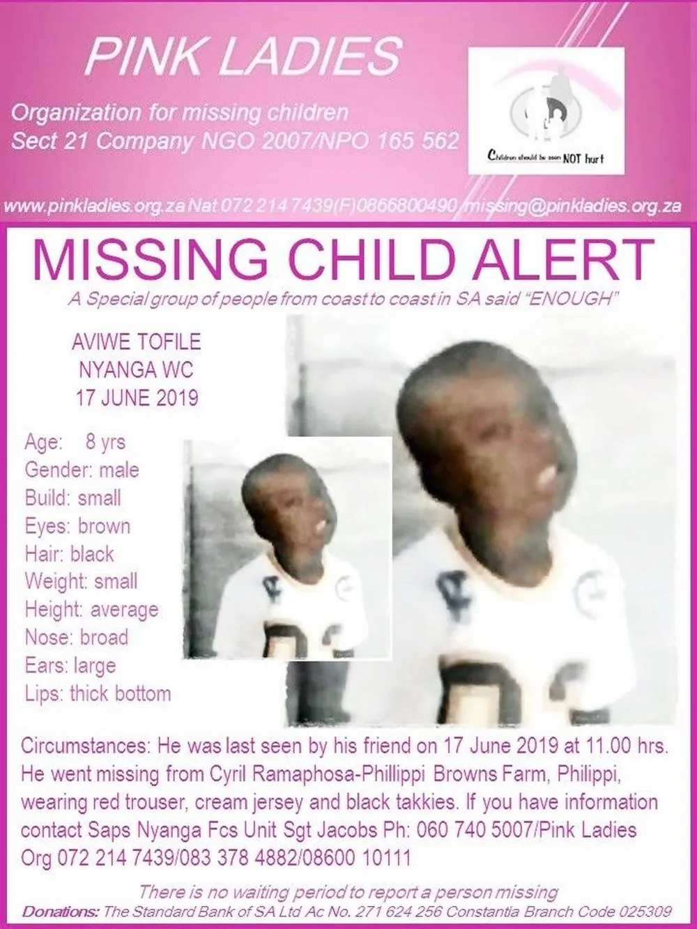 According to the Pink Ladies Missing Children’s Organisation, Aviwe was last seen by his friend wearing red trousers, a cream jersey and black takkies while Jali was last seen wearing blue jeans, a blue shirt and school shoes. The police have appealed to the public to assist in finding the boys.