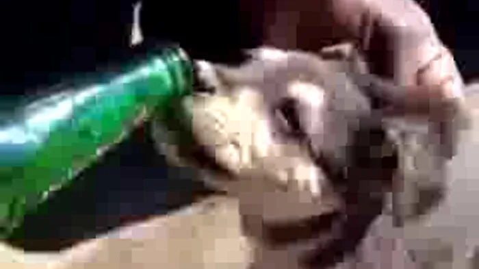 The minute-long video begins with the man holding the doggie by its head and ears, feeding it beer out of a green bottle.