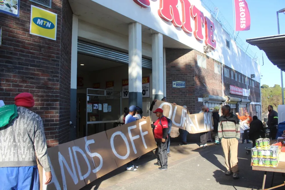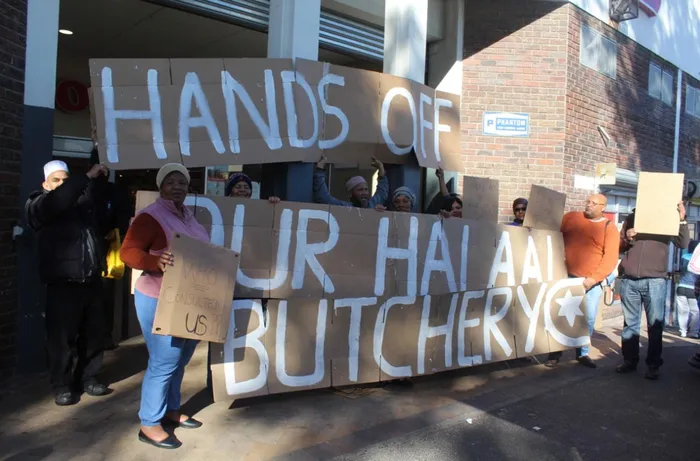 Residents picketed outside the store, with posters calling Shoprite “varkerag” and called for “Hands off our Halaal Butchery”.