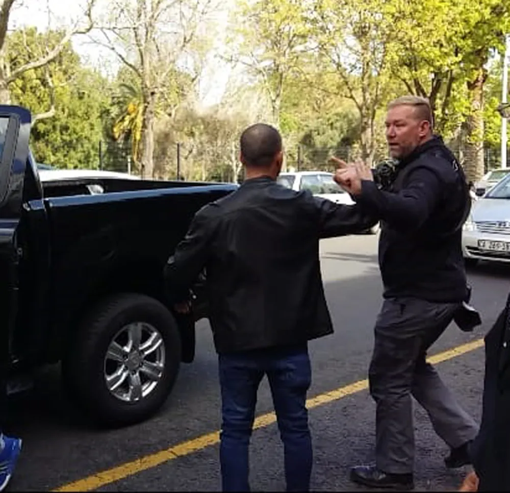 Outside court, more drama unfolded when Najwa’s brother, Waleed Dirk, was filmed headbutting a photographer from Die Burger, Jaco Marais, while he took images of the accused hiding their faces under hoodies and jackets as they left the court.