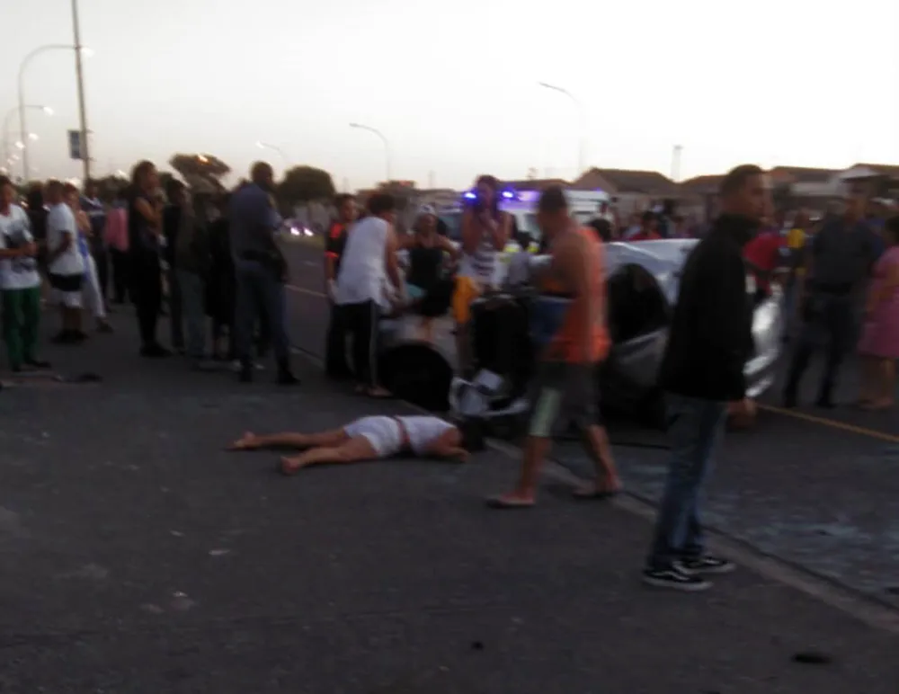 Witnesses say four of the passengers, including a little boy, flew out of the silver Opel Corsa when the driver apparently lost control of the car and collided with a white Toyota Corolla and then smashed into a light pole.