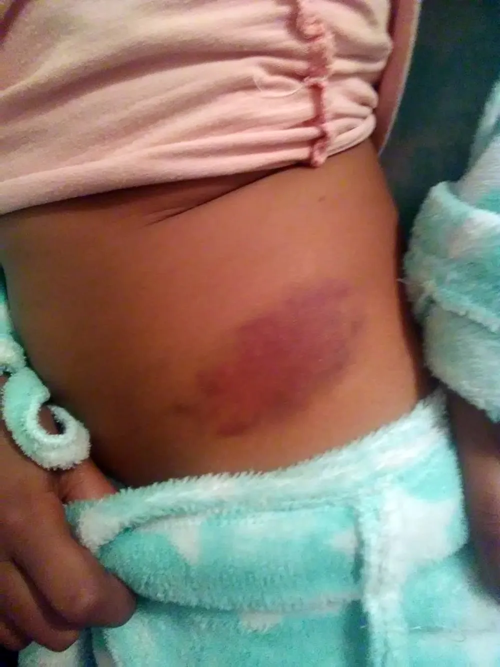 In a photograph shown to the Daily Voice, the girl shows a large blue bruise on her abdomen which she says was caused in April when one of the girls allegedly kicked her in class “for no reason”.
