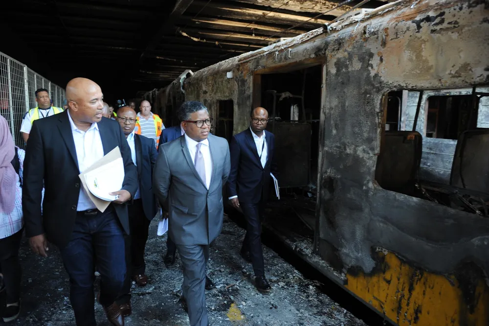 WRECK: Minister Fikile Mbalula inspects burnt-out train in city. Picture: Armand Hough