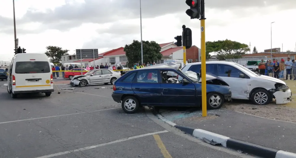 “According to reports, a white Toyota Quantum taxi driving along Duinefontein Road towards the police station, disobeyed a red traffic light and collided head-on with vehicles crossing the intersection.