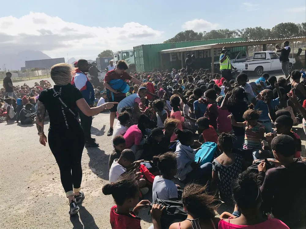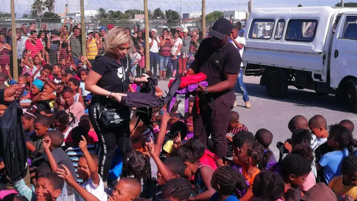 HELPING HAND: Nicole, relatives and staff hand out stationery packs to poor Valhalla Park kids. Picture: Supplied HELPING HAND: Nicole, relatives and staff hand out stationery packs to poor Valhalla Park kids. Picture: Supplied