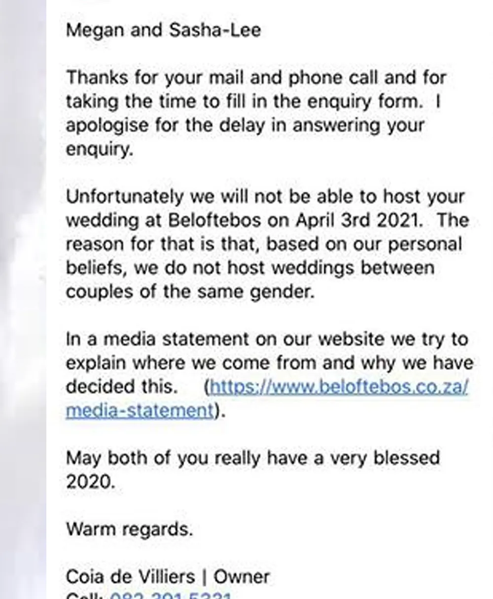 Sasha-Lee Heekes and fiancée Megan Watling wanted to celebrate their marriage at Beloftebos in April 2021 but the owners refused on the grounds of Christianity not allowing same sex marriage.