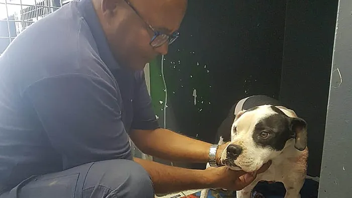 The dog, a black and white medium-sized pit bull terrier, had been stabbed several times and was admitted without a name.