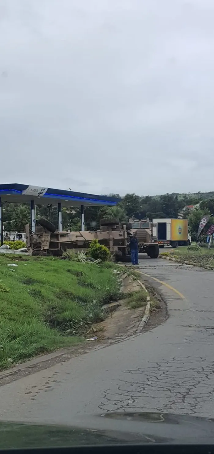 “The driver of the Casspir military vehicle lost control. It hit the barricade on the side of the road and fell on its left side on the road,” Maseko said.
