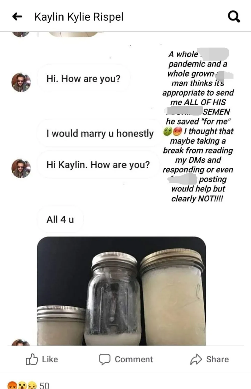 On Wednesday, she blocked the semen stalker, who then approached her sister and asked her to pass a message.