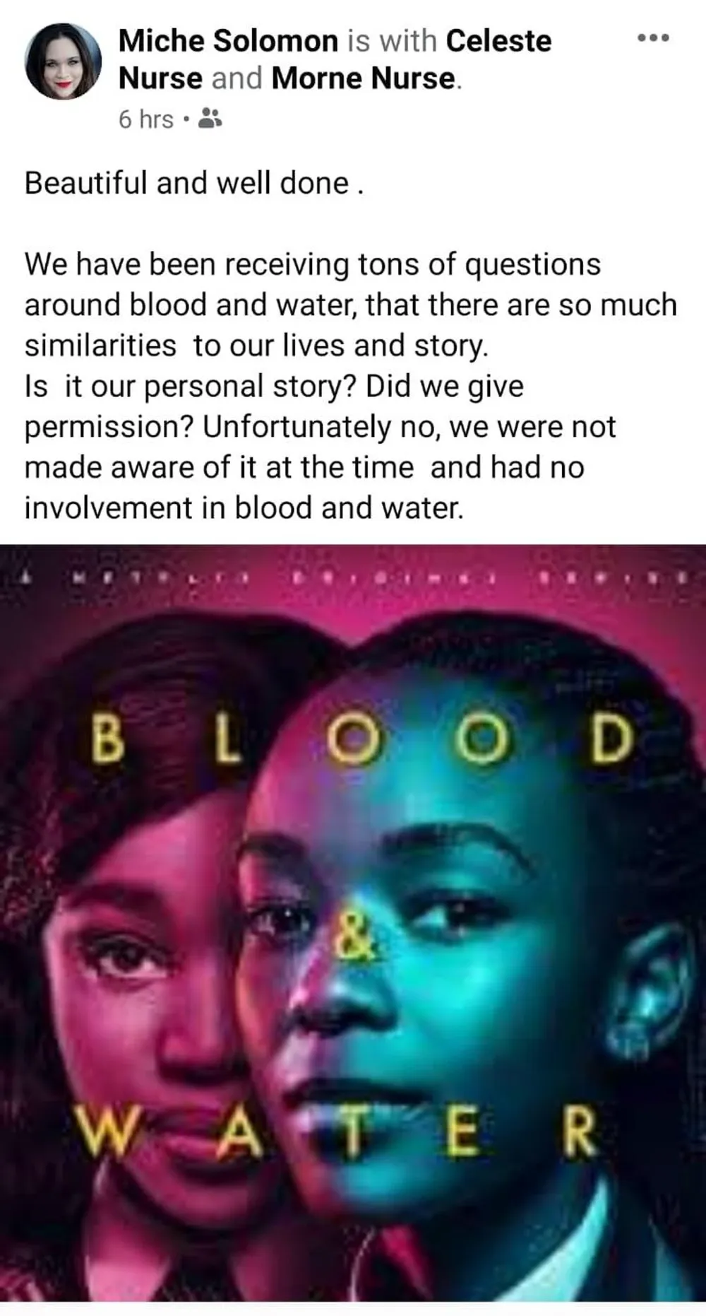Miché posted on Facebook: “Beautiful and well done. We have been receiving tons of questions around Blood & Water, that there are so much similarities to our lives and story.