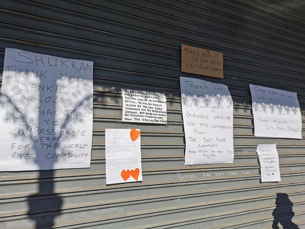 Patients left messages on the door and stoep of Dr Jakoet’s surgery in Salt River.
