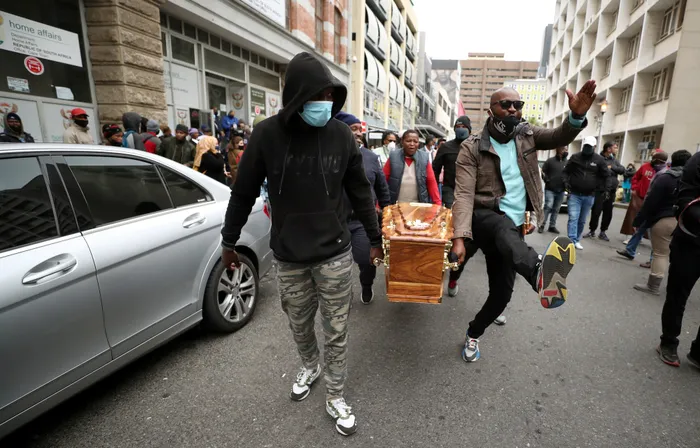 Striking funeral workers carry a coffin during a protest over changes to a host of procedures and regulations, during the coronavirus disease (COVID-19) outbreak in Cape Town, South Africa, September 16, 2020. REUTERS/Mike Hutchings