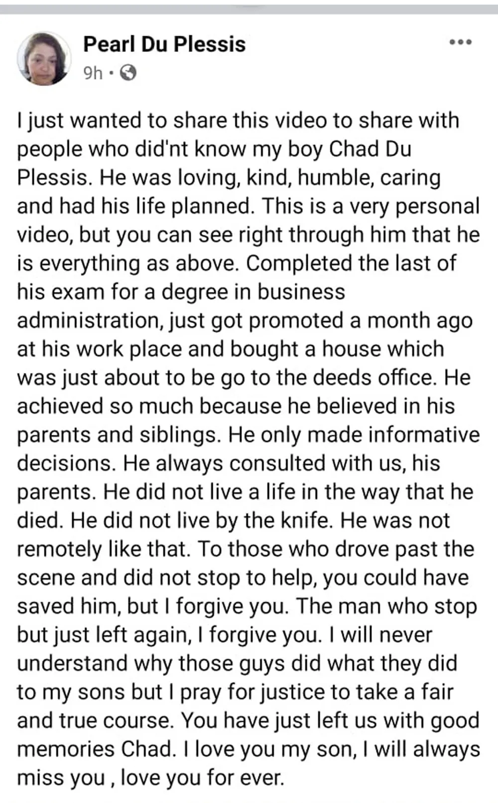 In an emotional Facebook post, Pearl du Plessis shared a sweet video of Chad congratulating his sister on her 18th birthday.