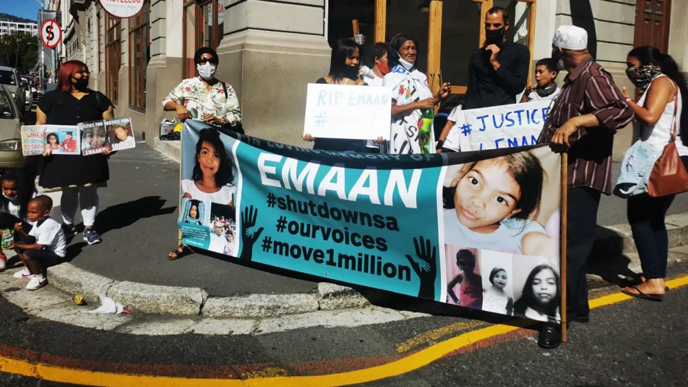 A large group of protesters descended on the Western Cape High Court on Friday morning as skollies accused of killing Ayesha Kelly, 10, and seven-year-old Emaan Solomons appeared for their pre-trial hearings.