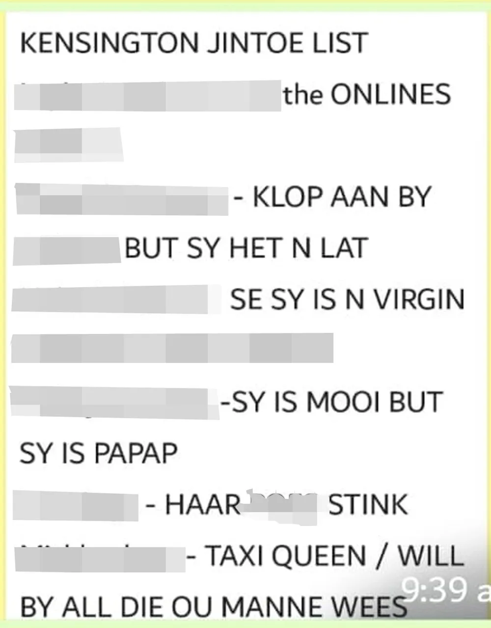 Community Police Forum chairperson, Cheslyn Steenberg, says the “demeaning” list was sent to him on Facebook: “The list is very distasteful and is spreading on WhatsApp groups and Facebook inboxes.