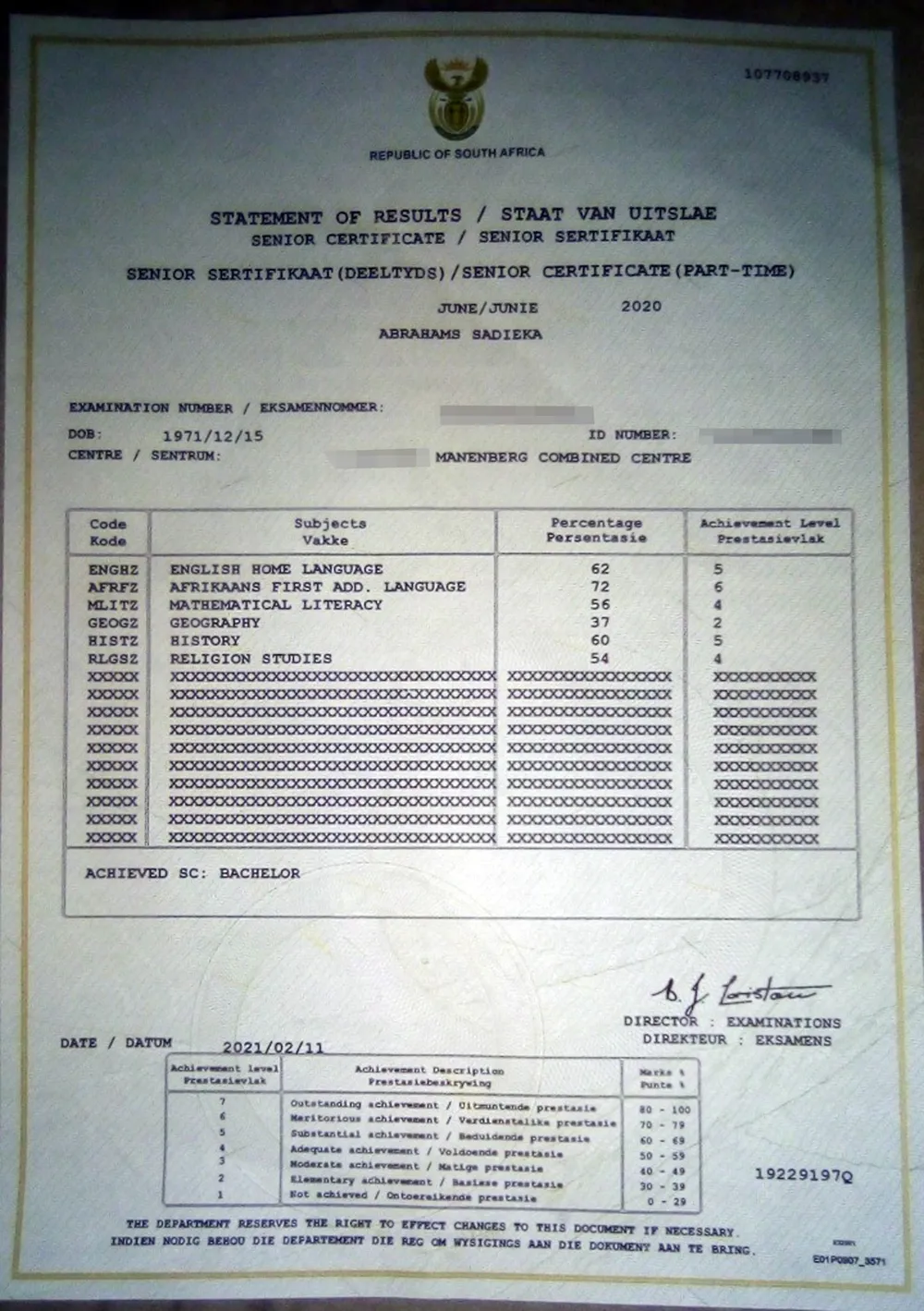 Her subjects were English (62%), Afrikaans (72%), Math Literacy (56%), Geography (37%), History (60%) and Religion Studies (54%).