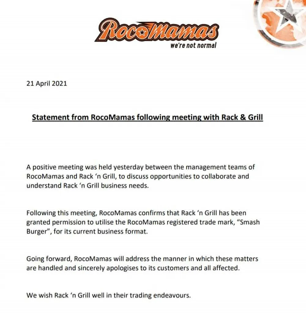 Fast food chain RocoMamas has “granted permission” for small take-aways Rack ’n Grill to use its trademark “Smash Burger” name on its menu.