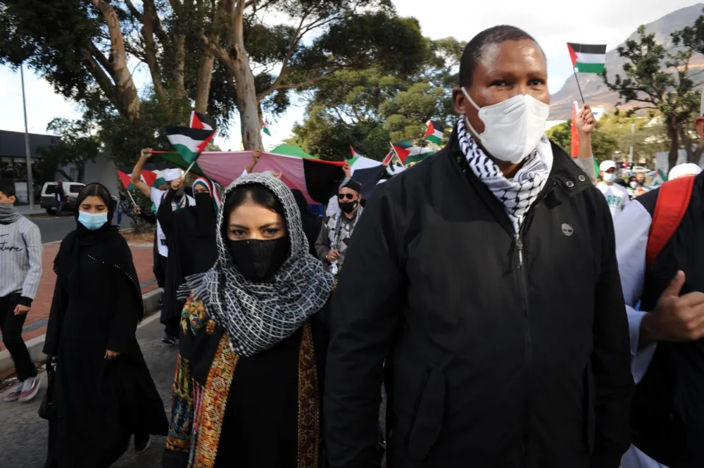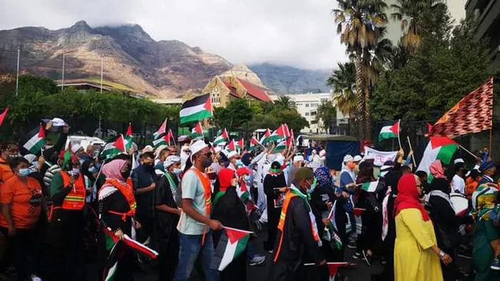 The demonstration, which started at the Muir Street mosque, called for sanctions to be imposed on Israel, and was organised by the Muslim Judicial Council (SA) and the Al-Quds Foundation.