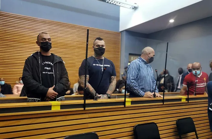 POSTPONED: Nafiz Modack, Zane Kilian, Jacques Cronje and Ashley Tabisher at Blue Downs Magistrates’ Court . Picture: Monique Duval