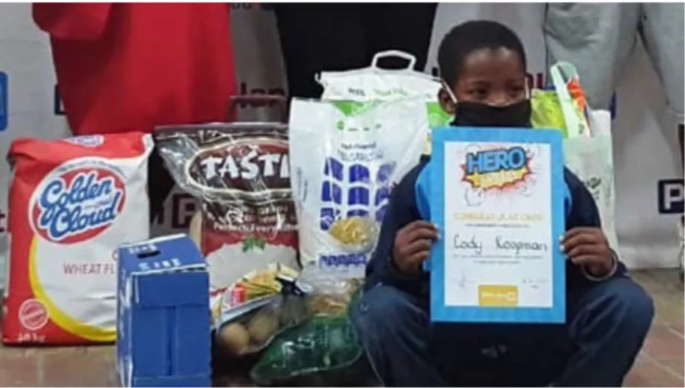 The Club presented Codie with the Environmental Hero Award certificate and badge, as well as a R1000 Pick n Pay gift voucher for him to spend on toys, and a food hamper for his family worth R5000.