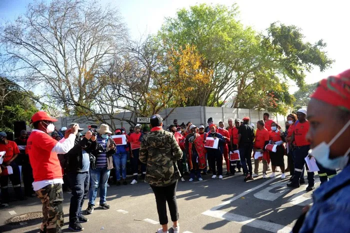About 100 EFF demonstrators arrived in taxis with banners and gathered at the corner of Tokai and Myrtle Road before marching to the library parking area to hand over a memorandum of their grievances to a City of Cape Town representative.