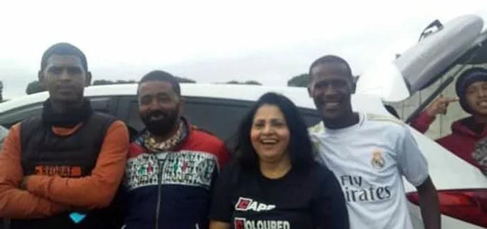 Claudine Coleridge, who is a candidate for Leonsdale ward councillor in the upcoming elections, wore a Cape Coloured Congress T-shirt while standing with five men, who are alleged to be skollies.