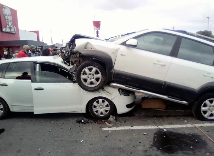 This was the shocking scene at the Liberty Promenade mall on Saturday when a man drove over a traffic circle and landed on top of a parked car outside KFC.