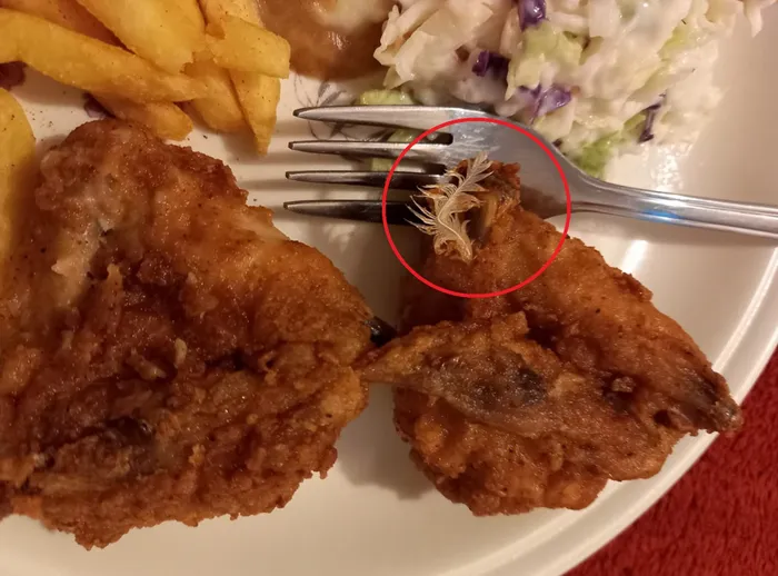 The family ordered two All in One Plus meals totalling R259.80, but as they were about to dig in, they say they found feathers and fat on the raw pieces of chicken.