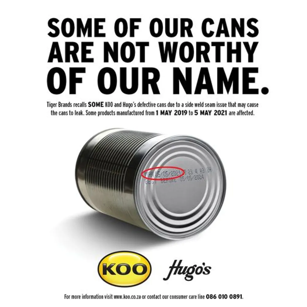 About 20 million blikkies of KOO and Hugo's canned veggies, which were produced from 1 May 2019 to 5 May 2021 were being recalled due to defective cans.
