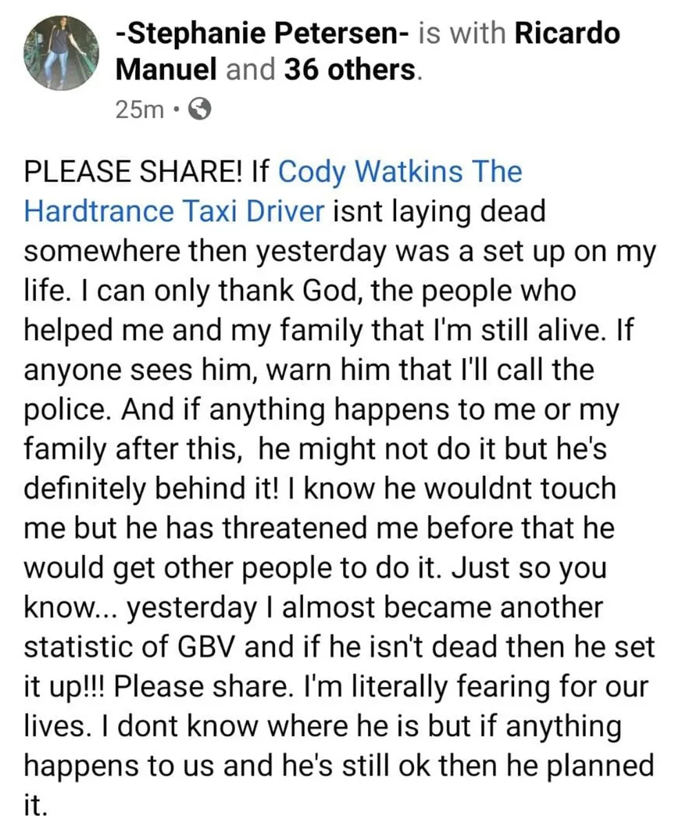 On Saturday, 25 September, his girlfriend Stephanie Petersen posted on Facebook: “Please Share! If Cody Watkins The Hardtrance Taxi Driver isn’t lying dead somewhere then yesterday was a set up on my life.