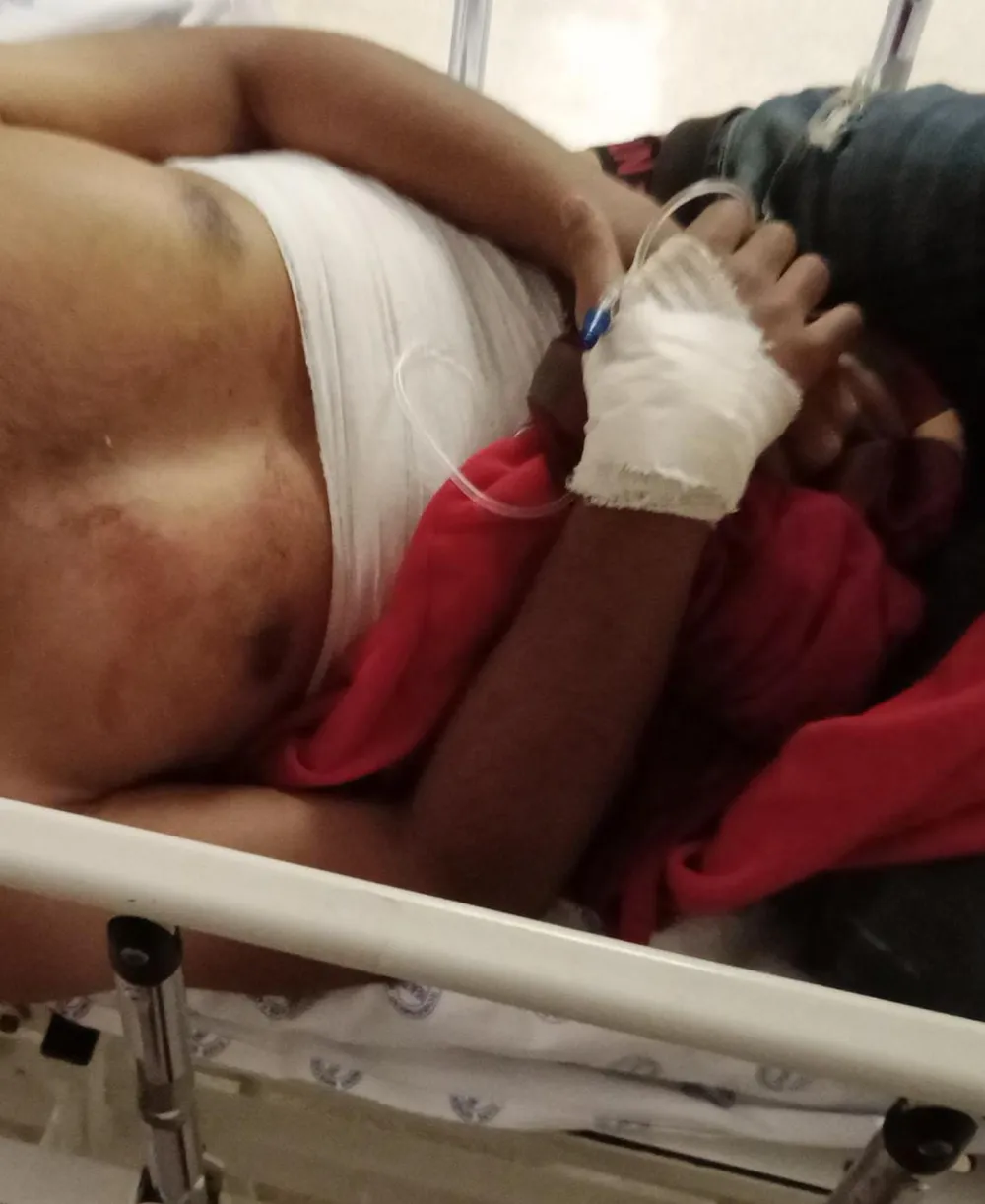 “They broke a glass bottle over my head, busted my hand, trapped (stepped on) me, the blood was running from my head.
