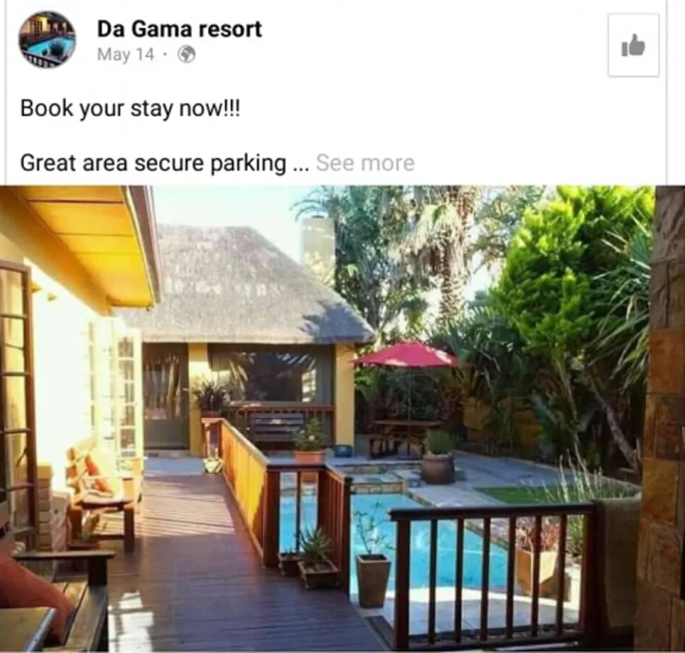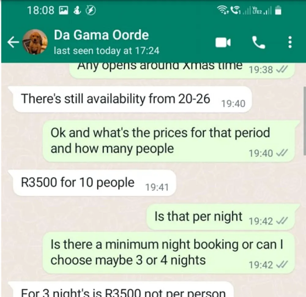 “The price for the week was R3500 and the deposit was R800, which we paid immediately into the bank account of Da Gama Oorde,” she explains.
