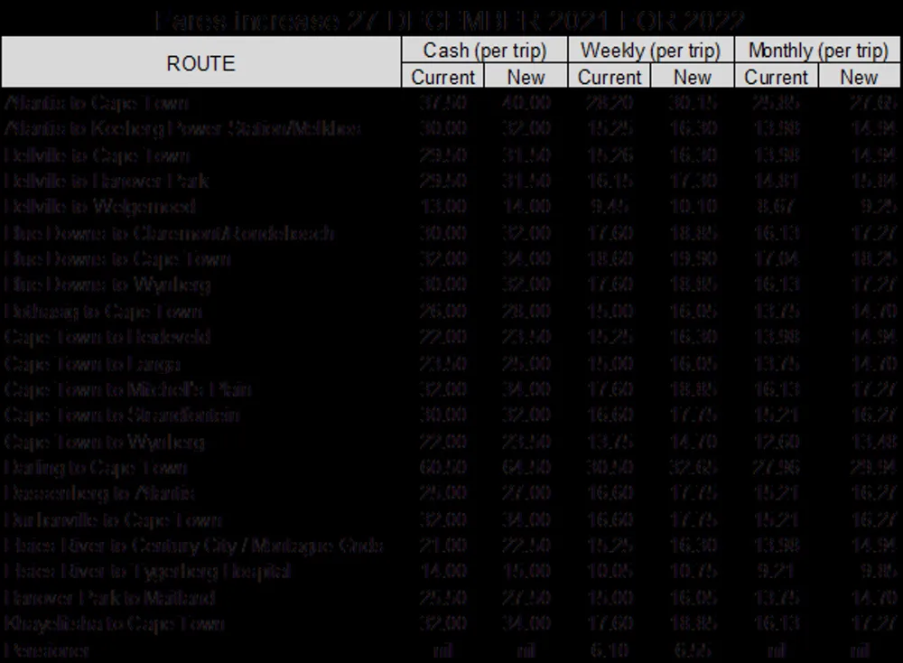 “As such, Golden Arrow will be implementing a 7% average across the board increase on all cash and multi-journey products (formerly known as clipcards). GABS Gold Cards, a once-off purchase, will however remain at R35.”