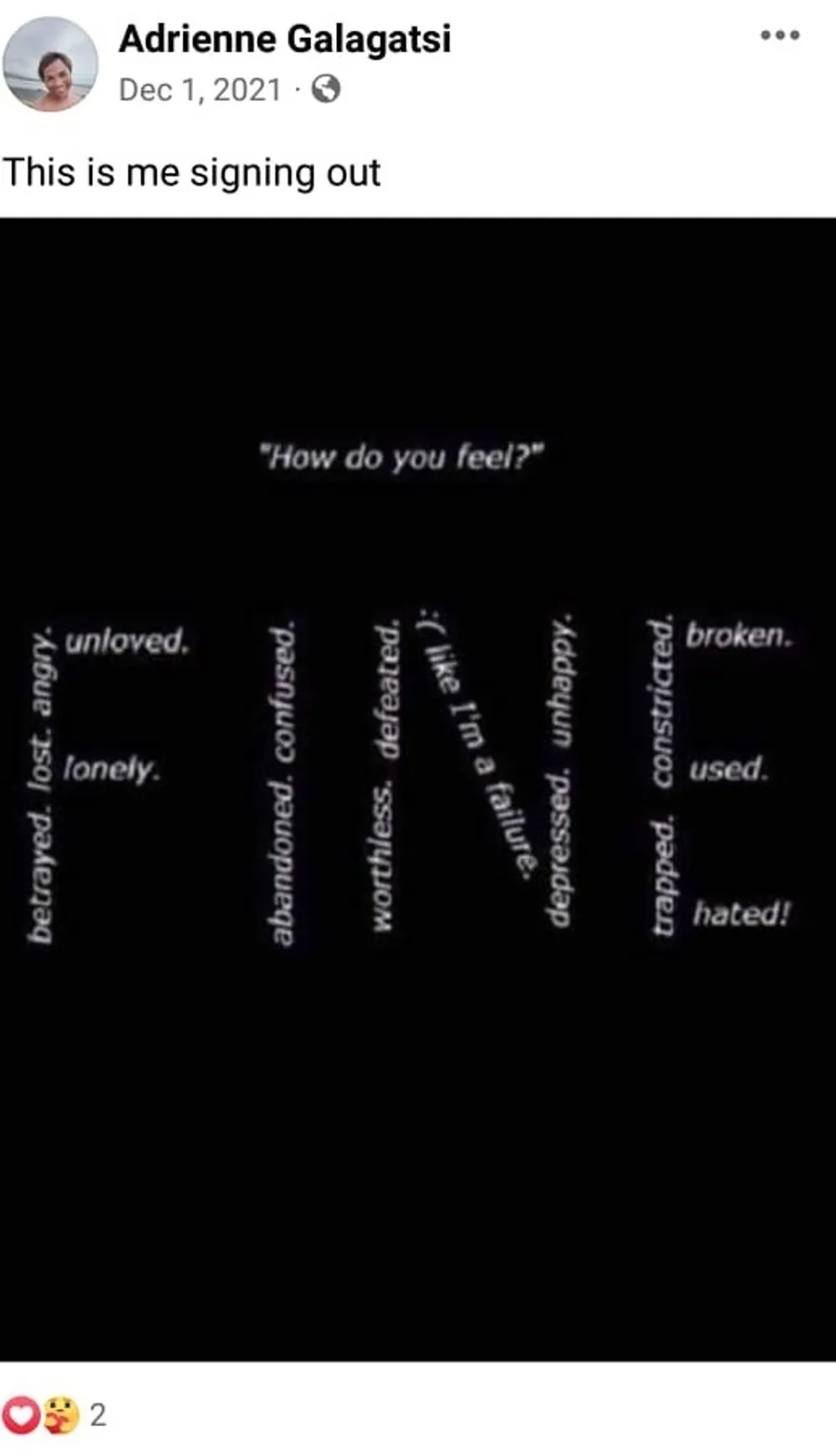 He posted a meme that asked “How do you feel?” and the word FINE is made up of smaller words like “unloved, lonely, betrayed, lost, worthless, hated”, among others.