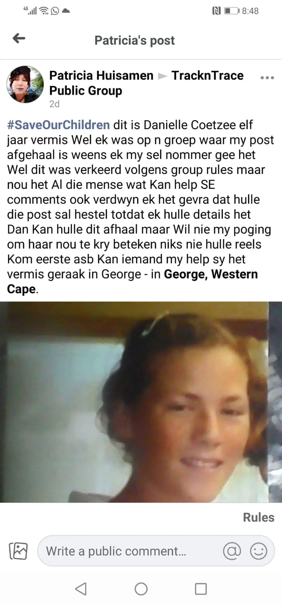 The newspaper was in contact with Huisamen and Track n Trace after leads were being followed by people who alerted them that they believed Danielle was living on the streets in Cape Town.
