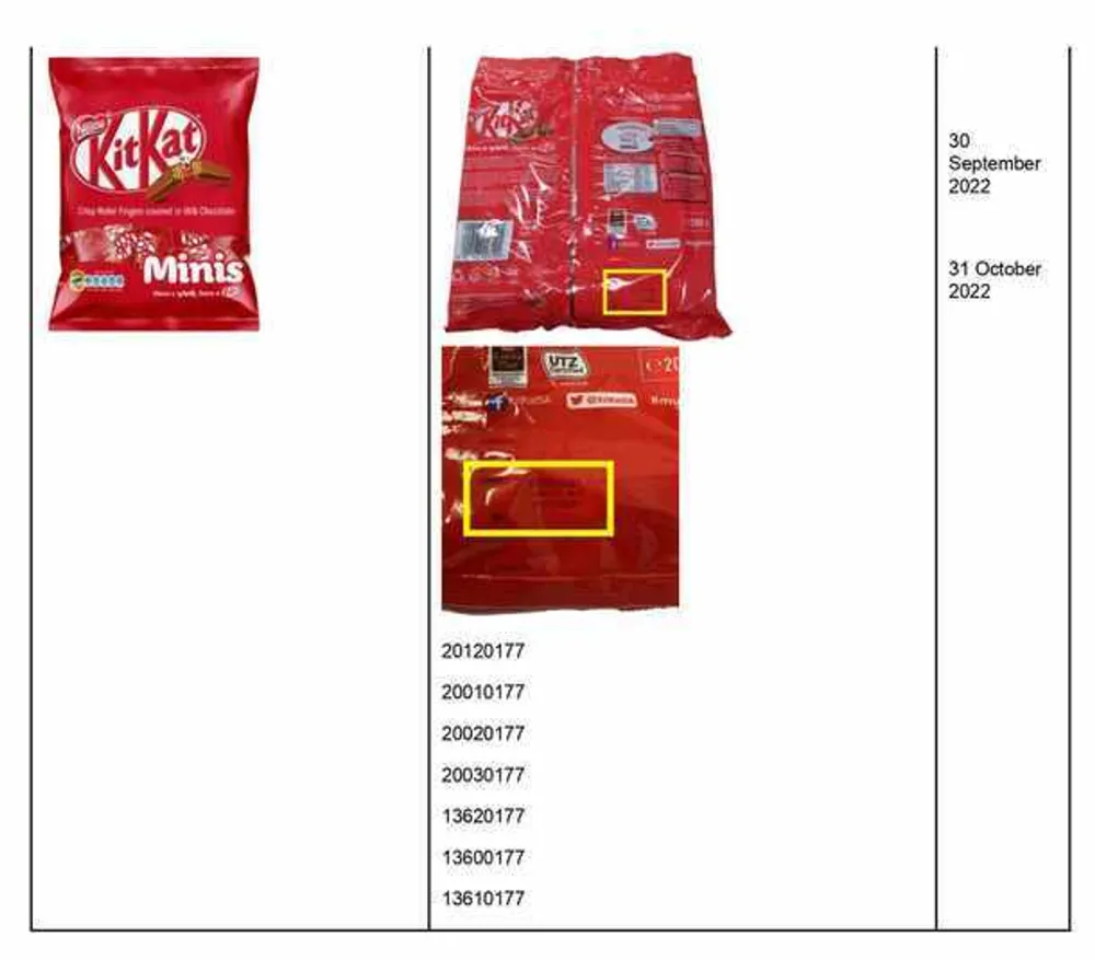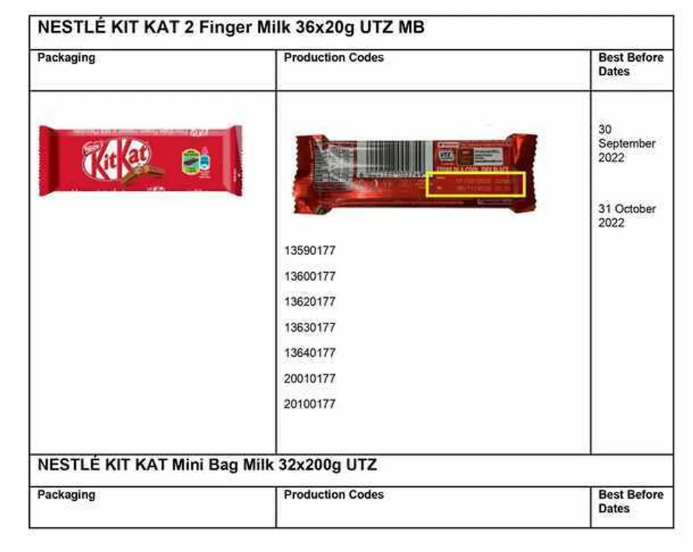 Milk chocolate KitKat products with different production codes from those listed here are not affected by this recall either.