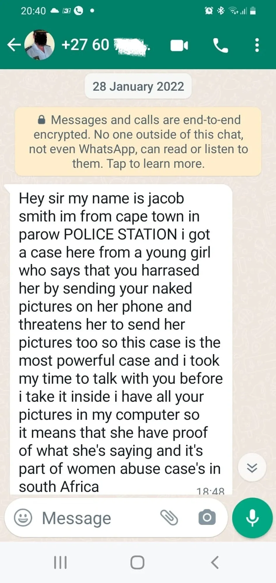 “The next day another number sent me a WhatsApp message saying they are Jacob Smith from Parow Police Station in Cape Town and claimed that I asked for pictures and sent pictures of myself, which I never did.”