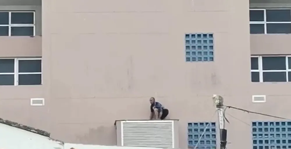 While some people could be heard making jokes and shouting for the man to jump, residents looking on were worried about the man who looked wobbly on his legs and his clothing was torn.