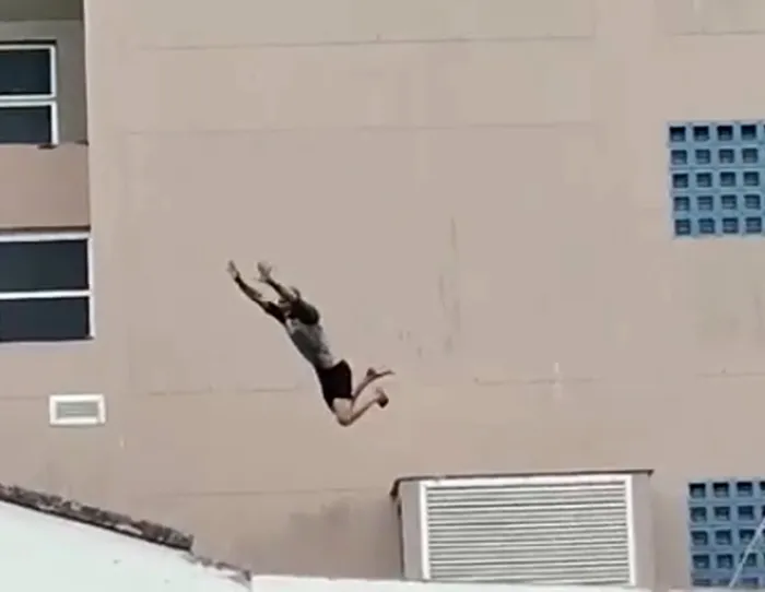 A video was shared online of the man, who seemed drunk, standing on the aircon unit box outside the window of the New Apostolic Church in Kilimanjaro Street in Tafelsig just after 4pm.