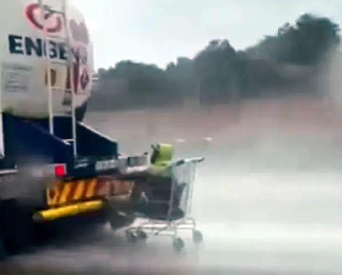 A video emerged online on Monday showing a daring Gauteng man riding in a shopping trolley while holding onto the back of an Engen petrol tanker driving on the N1.