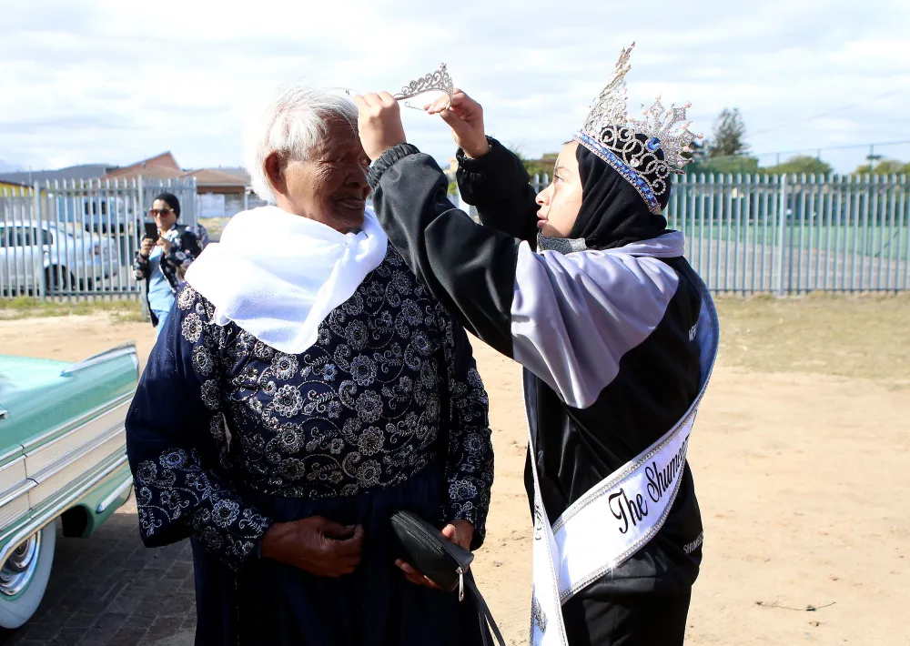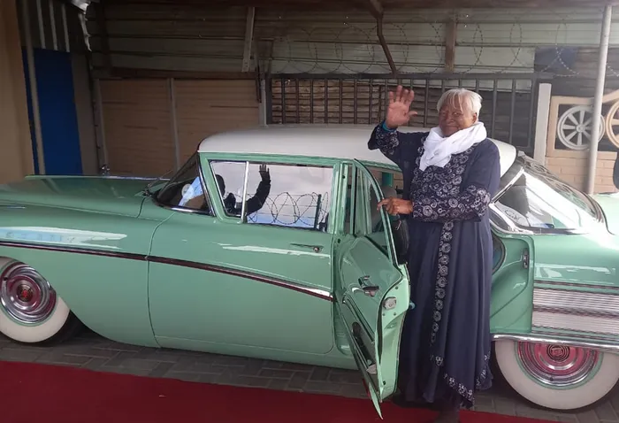 The ouma was driven like an A-lister in a 1985 Buick Special to the Sarepta Hall in Kuils River, uitgevat in a new outfit.