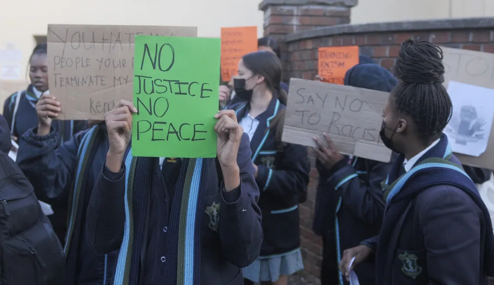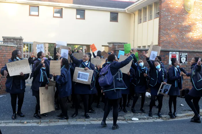 The pupils demonstrated outside with placards, discouraging discrimination against black students and chanting in IsiXhosa: “Racism towards black learners at this school must end.”